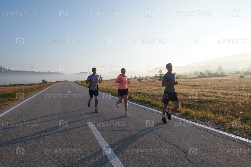 Группа друзей, спортсменов и любителей бега бегом ранним утром пробегает сквозь туманный рассвет, зарядившись энергией восходящего солнца и окруженная спокойной красотой природы