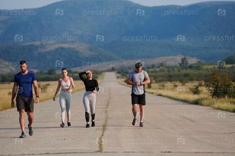 Группа друзей ведет здоровый образ жизни, бегая на свежем воздухе в солнечный день, занимаясь фитнесом и наслаждаясь бодрящим эффектом физических упражнений и природы