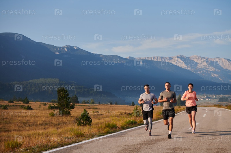 Группа друзей ведет здоровый образ жизни, бегая на свежем воздухе в солнечный день, занимаясь фитнесом и наслаждаясь бодрящим эффектом физических упражнений и природы