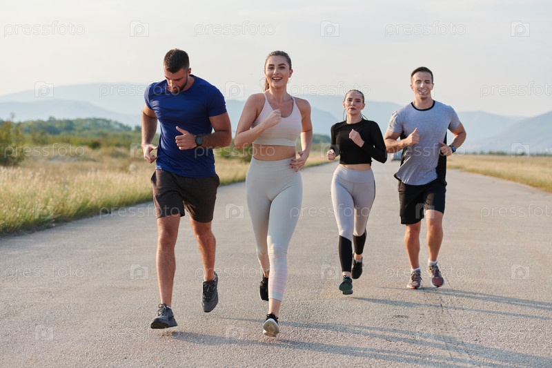 Группа друзей ведет здоровый образ жизни, бегая на свежем воздухе в солнечный день, занимаясь фитнесом и наслаждаясь бодрящим эффектом физических упражнений и природы