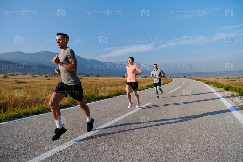 Группа друзей ведет здоровый образ жизни, бегая на свежем воздухе в солнечный день, занимаясь фитнесом и наслаждаясь бодрящим эффектом физических упражнений и природы