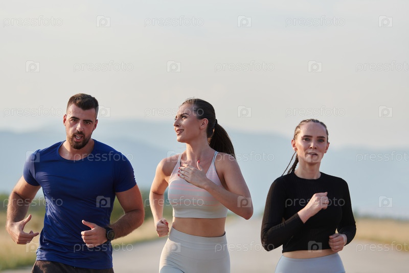 Группа друзей ведет здоровый образ жизни, бегая на свежем воздухе в солнечный день, занимаясь фитнесом и наслаждаясь бодрящим эффектом физических упражнений и природы