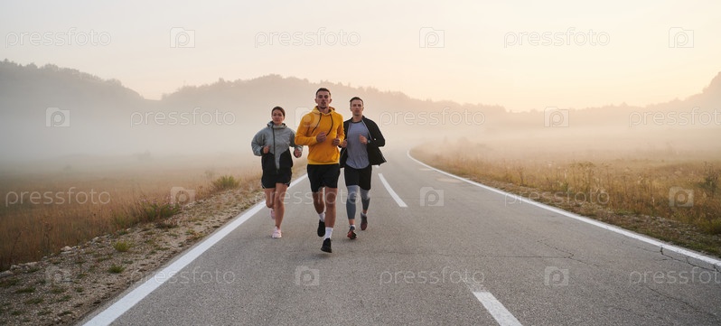 Группа коллег, стремясь к общей цели, бросает вызов туманному утреннему воздуху, их решимость видна в каждом шаге