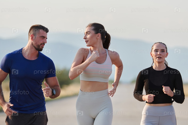 Группа друзей ведет здоровый образ жизни, бегая на свежем воздухе в солнечный день, занимаясь фитнесом и наслаждаясь бодрящим эффектом физических упражнений и природы