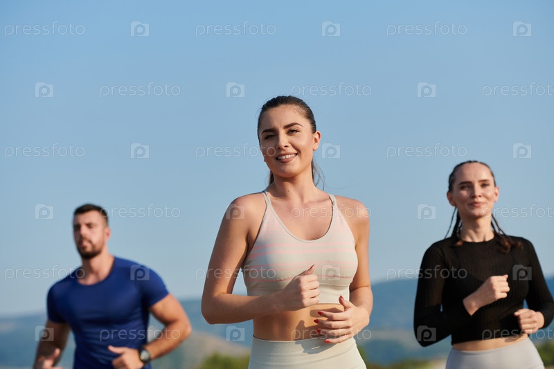 Группа друзей ведет здоровый образ жизни, бегая на свежем воздухе в солнечный день, занимаясь фитнесом и наслаждаясь бодрящим эффектом физических упражнений и природы