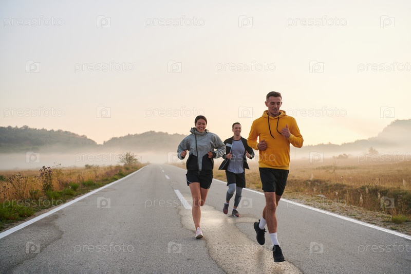 Группа друзей, спортсменов и любителей бега бегом ранним утром пробегает сквозь туманный рассвет, зарядившись энергией восходящего солнца и окруженная спокойной красотой природы