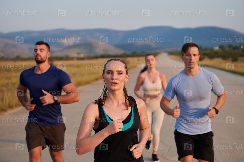 Группа друзей ведет здоровый образ жизни, бегая на свежем воздухе в солнечный день, занимаясь фитнесом и наслаждаясь бодрящим эффектом физических упражнений и природы