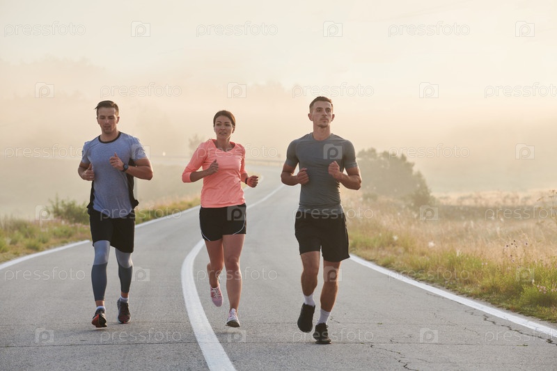 Группа друзей, спортсменов и любителей бега бегом ранним утром пробегает сквозь туманный рассвет, зарядившись энергией восходящего солнца и окруженная спокойной красотой природы