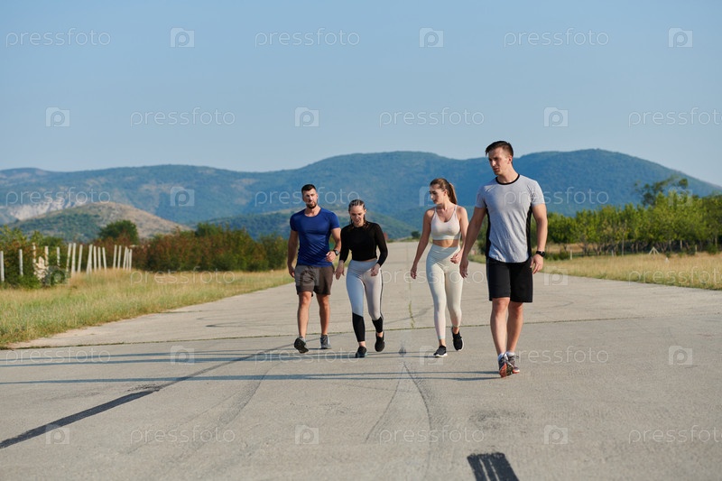 Группа друзей ведет здоровый образ жизни, бегая на свежем воздухе в солнечный день, занимаясь фитнесом и наслаждаясь бодрящим эффектом физических упражнений и природы