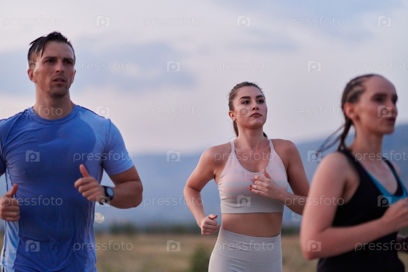 Разнообразная группа бегунов тренируется вместе на закате