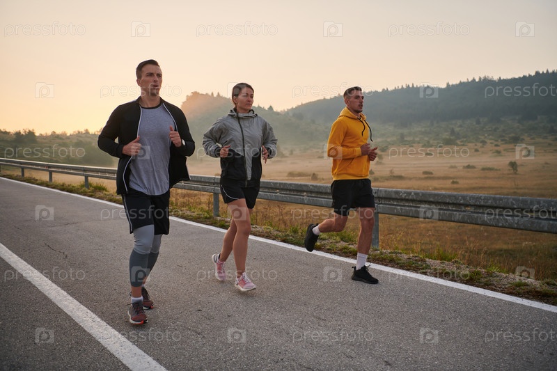 Группа коллег, стремясь к общей цели, бросает вызов туманному утреннему воздуху, их решимость видна в каждом шаге