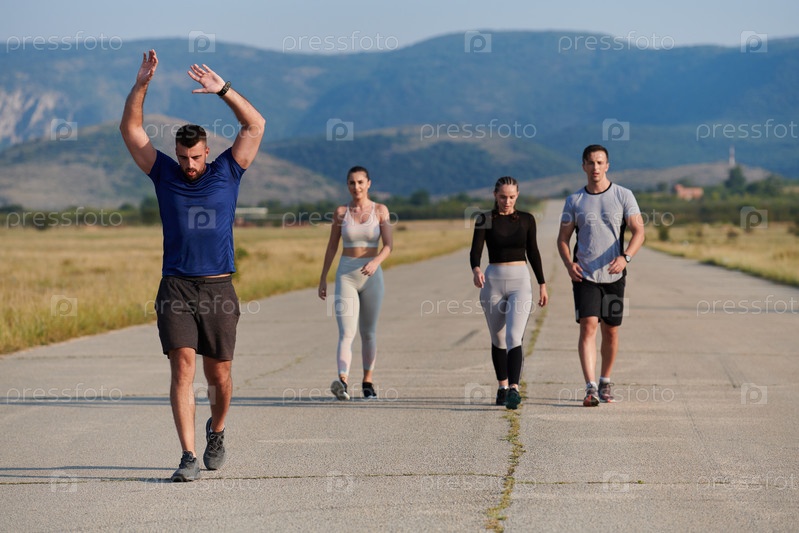 Группа друзей ведет здоровый образ жизни, бегая на свежем воздухе в солнечный день, занимаясь фитнесом и наслаждаясь бодрящим эффектом физических упражнений и природы