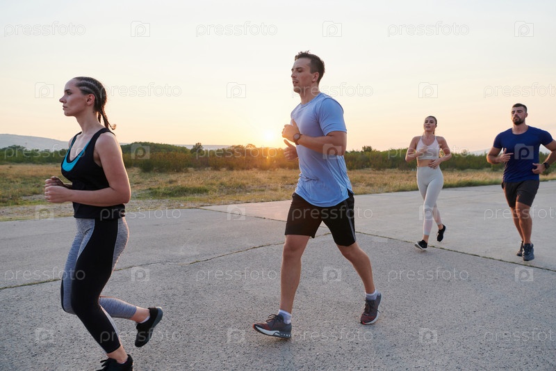 Разнообразная группа бегунов тренируется вместе на закате