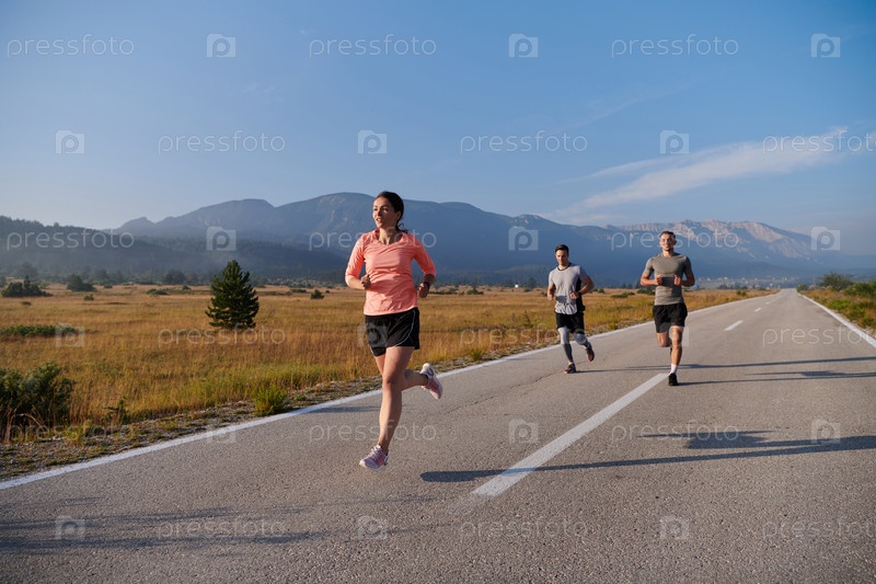 Группа друзей ведет здоровый образ жизни, бегая на свежем воздухе в солнечный день, занимаясь фитнесом и наслаждаясь бодрящим эффектом физических упражнений и природы