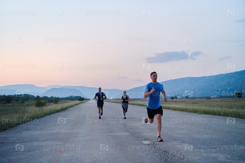 Разнообразная группа бегунов тренируется вместе на закате