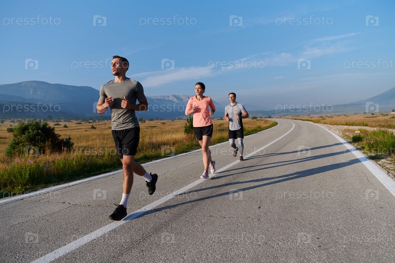 Группа друзей ведет здоровый образ жизни, бегая на свежем воздухе в солнечный день, занимаясь фитнесом и наслаждаясь бодрящим эффектом физических упражнений и природы