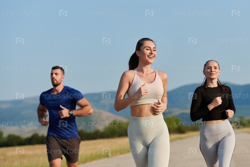 Группа друзей ведет здоровый образ жизни, бегая на свежем воздухе в солнечный день, занимаясь фитнесом и наслаждаясь бодрящим эффектом физических упражнений и природы
