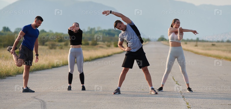 Разнообразная группа спортсменов вместе готовится к забегу