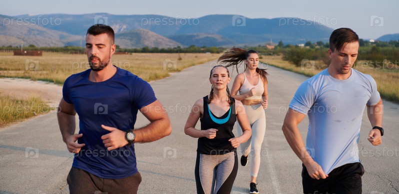 Группа друзей ведет здоровый образ жизни, бегая на свежем воздухе в солнечный день, занимаясь фитнесом и наслаждаясь бодрящим эффектом физических упражнений и природы