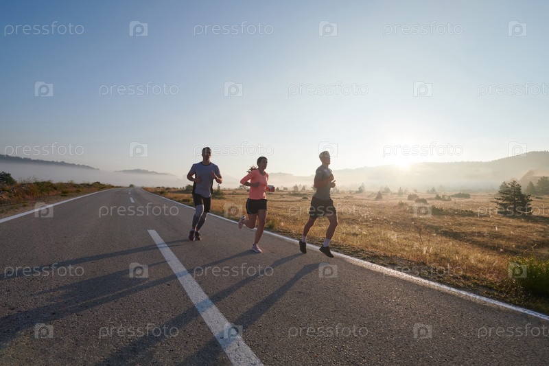 Группа друзей, спортсменов и любителей бега бегом ранним утром пробегает сквозь туманный рассвет, зарядившись энергией восходящего солнца и окруженная спокойной красотой природы