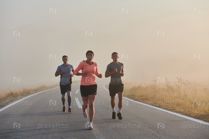 Группа друзей, спортсменов и любителей бега бегом ранним утром пробегает сквозь туманный рассвет, зарядившись энергией восходящего солнца и окруженная спокойной красотой природы
