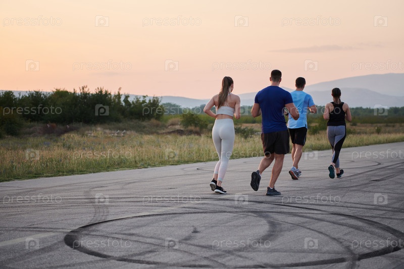 Разнообразная группа бегунов тренируется вместе на закате