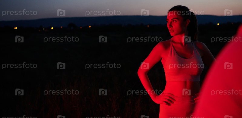 Спортсмен принимает позу в красном ночном сиянии