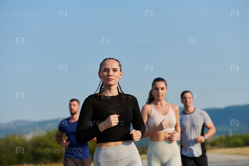 Группа друзей ведет здоровый образ жизни, бегая на свежем воздухе в солнечный день, занимаясь фитнесом и наслаждаясь бодрящим эффектом физических упражнений и природы