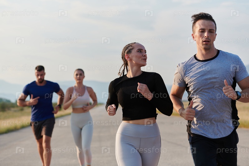 Группа друзей ведет здоровый образ жизни, бегая на свежем воздухе в солнечный день, занимаясь фитнесом и наслаждаясь бодрящим эффектом физических упражнений и природы
