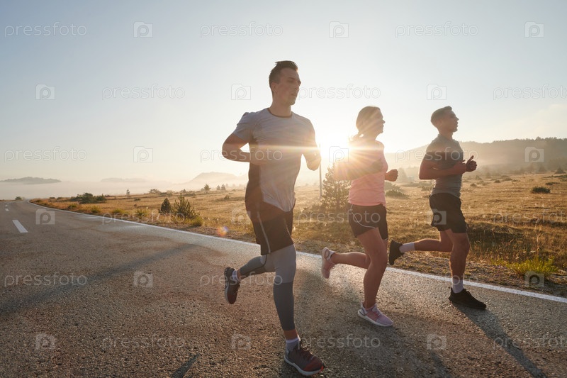 Группа друзей, спортсменов и любителей бега бегом ранним утром пробегает сквозь туманный рассвет, зарядившись энергией восходящего солнца и окруженная спокойной красотой природы