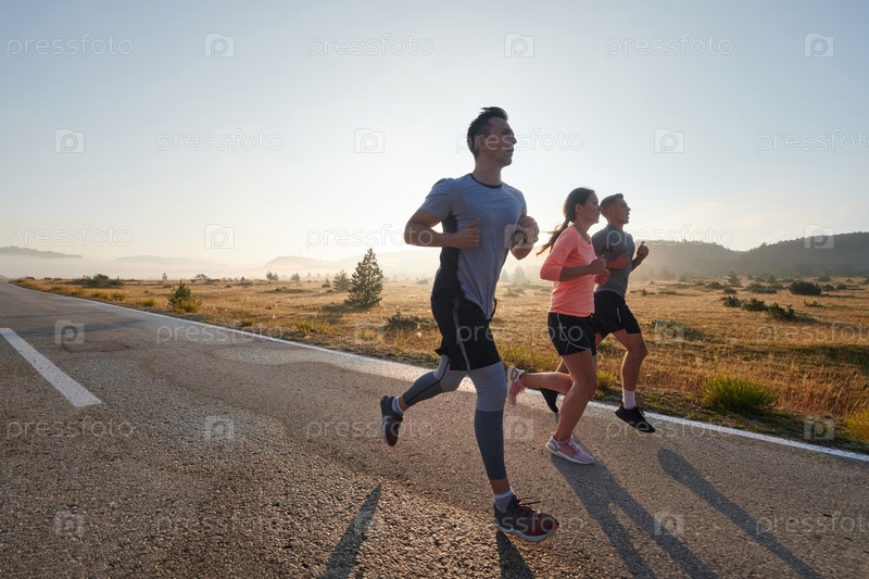 Группа друзей, спортсменов и любителей бега бегом ранним утром пробегает сквозь туманный рассвет, зарядившись энергией восходящего солнца и окруженная спокойной красотой природы