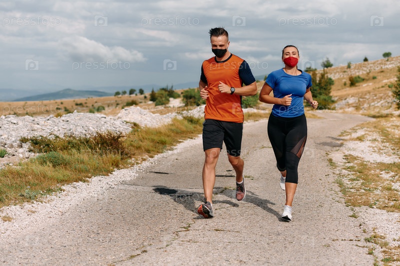 Пара бегает по природе утром в защитных масках