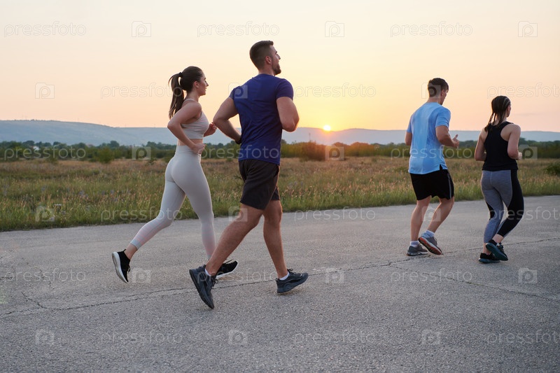 Разнообразная группа бегунов тренируется вместе на закате