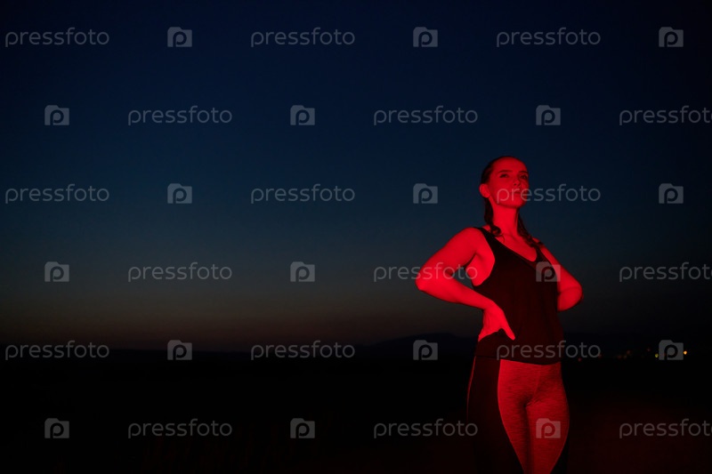 Спортсмен принимает позу в красном ночном сиянии