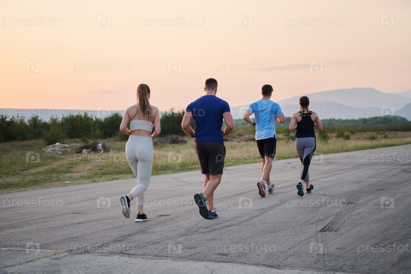 Группа друзей ведет здоровый образ жизни, бегая на свежем воздухе в солнечный день, занимаясь фитнесом и наслаждаясь бодрящим эффектом физических упражнений и природы
