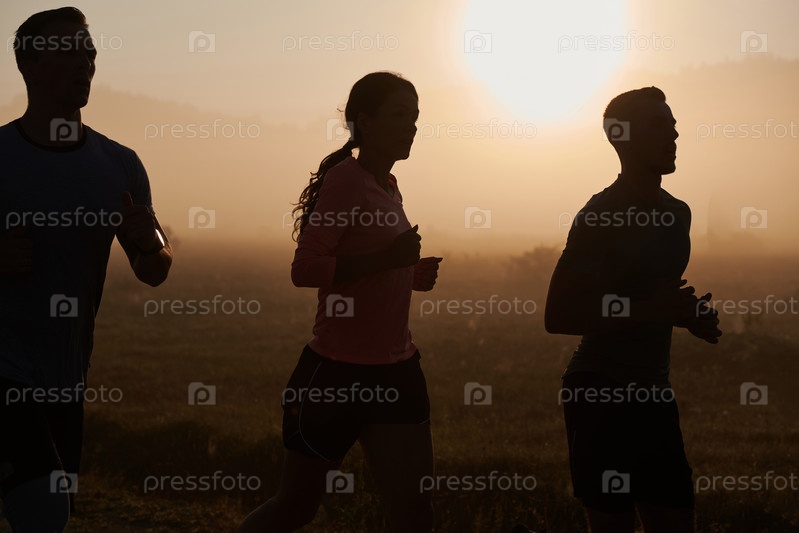 Группа друзей, спортсменов и любителей бега бегом ранним утром пробегает сквозь туманный рассвет, зарядившись энергией восходящего солнца и окруженная спокойной красотой природы