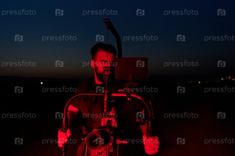 Ночная съемка: профессиональный видеооператор снимает бегущих спортсменов в темноте, освещенной красным светом