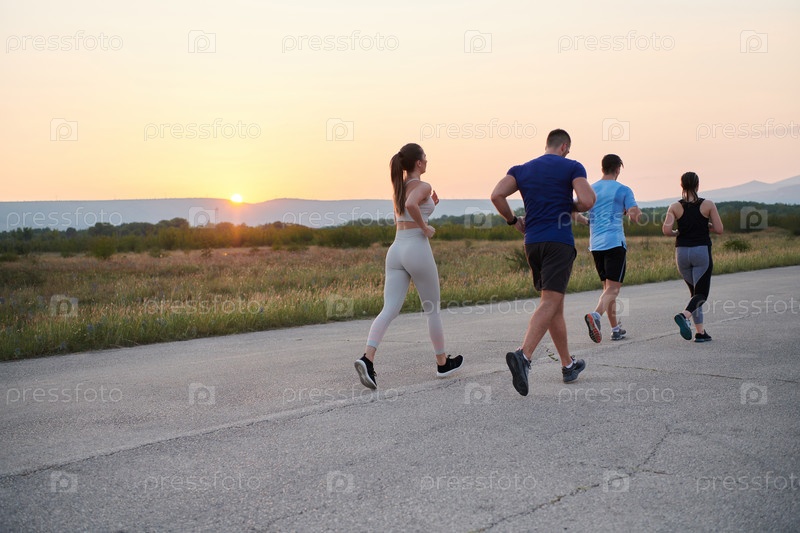 Разнообразная группа бегунов тренируется вместе на закате