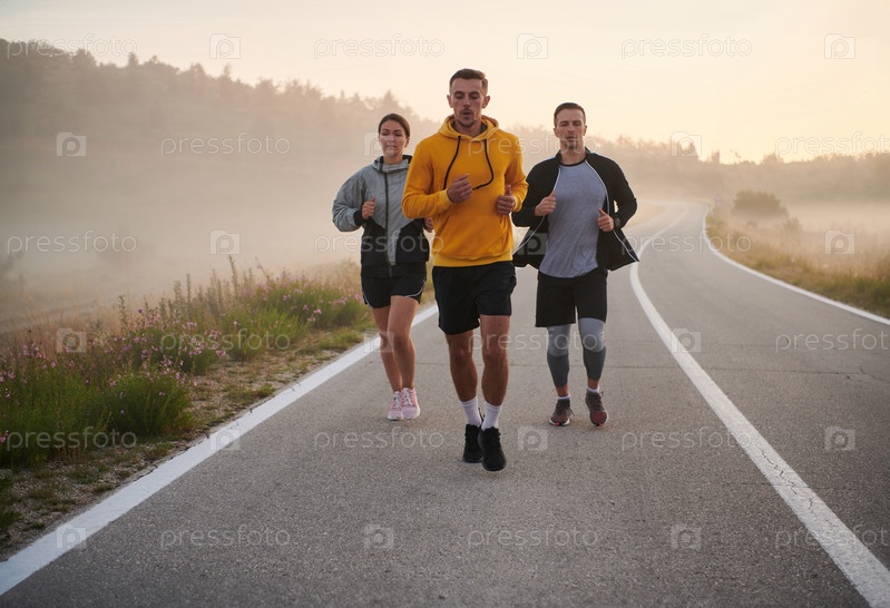 Группа коллег, стремясь к общей цели, бросает вызов туманному утреннему воздуху, их решимость видна в каждом шаге