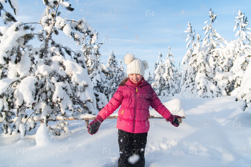 Игривое приключение милой девочки в залитых солнцем заснеженных горах