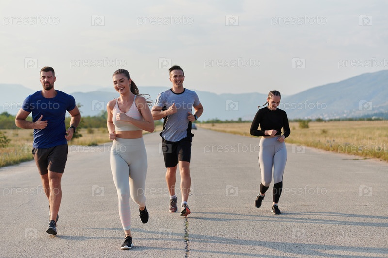 Группа друзей ведет здоровый образ жизни, бегая на свежем воздухе в солнечный день, занимаясь фитнесом и наслаждаясь бодрящим эффектом физических упражнений и природы