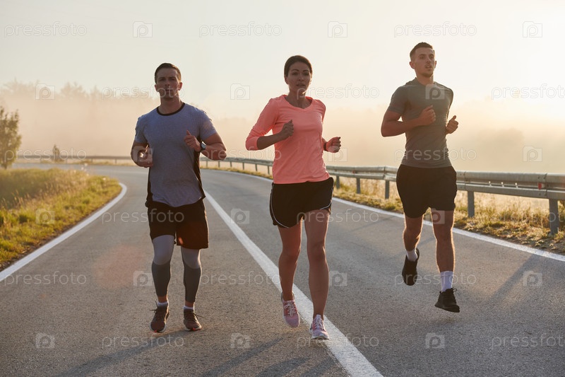 Группа друзей, спортсменов и любителей бега бегом ранним утром пробегает сквозь туманный рассвет, зарядившись энергией восходящего солнца и окруженная спокойной красотой природы
