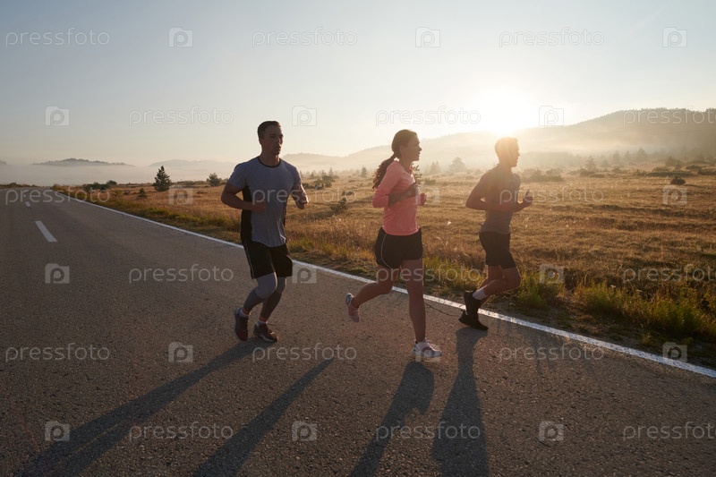 Группа друзей, спортсменов и бегунов бегут рано утром, пробегая сквозь туманный рассвет, зарядившись энергией восходящего солнца и окруженные спокойной красотой природы