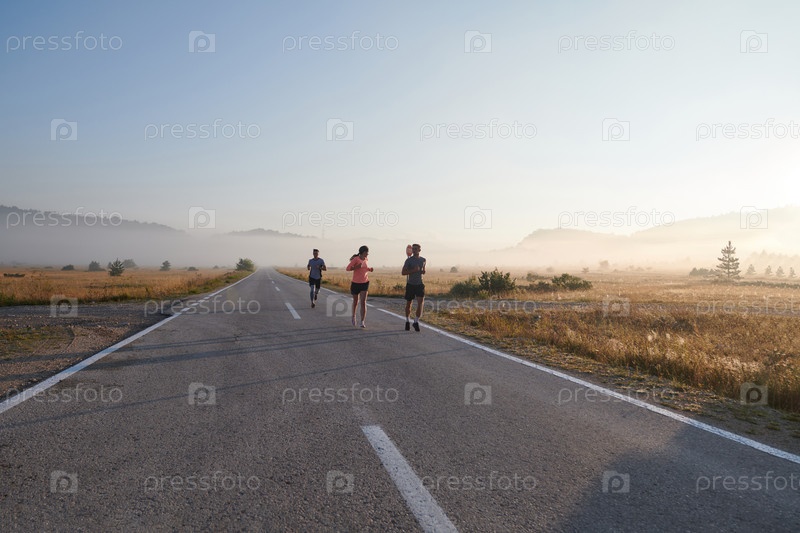 Группа друзей, спортсменов и любителей бега бегом ранним утром пробегает сквозь туманный рассвет, зарядившись энергией восходящего солнца и окруженная спокойной красотой природы