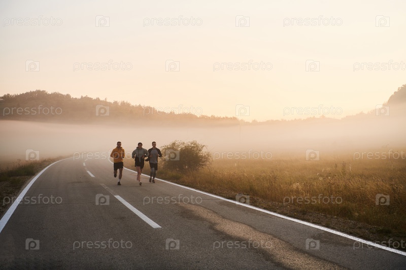 Группа друзей, спортсменов и любителей бега бегом ранним утром пробегает сквозь туманный рассвет, зарядившись энергией восходящего солнца и окруженная спокойной красотой природы