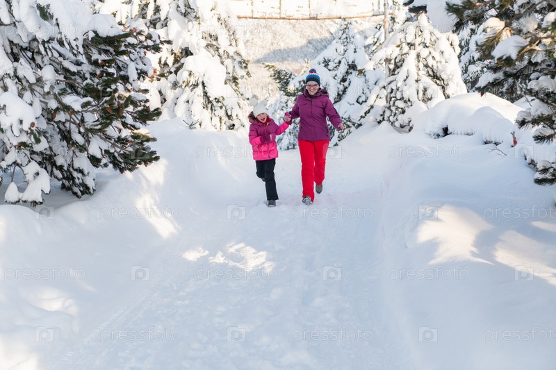 Блаженная пробежка матери и дочери по заснеженной зимней тропе
