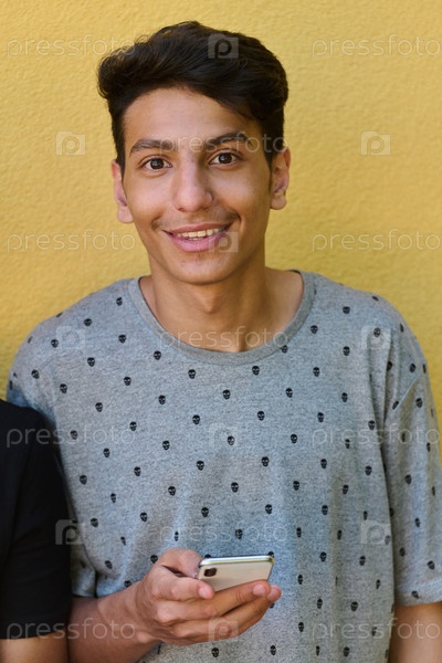 Ближневосточный подросток пользуется мобильным телефоном, прислонившись к желтой стене