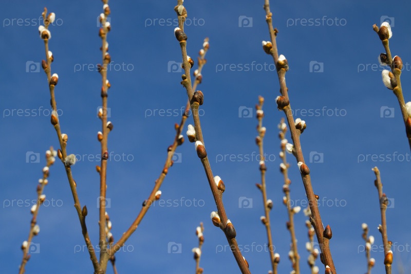 Открытка к вербному воскресенью. Тонкие ветки вербы с маленькими цветками в весеннем лесу на фоне голубого неба