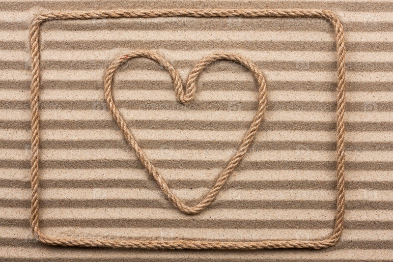 Сердце из веревки лежит на волнистом песке