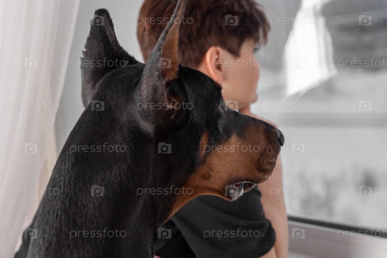 Женщина и доберман вместе смотрят в окно в дождливый день